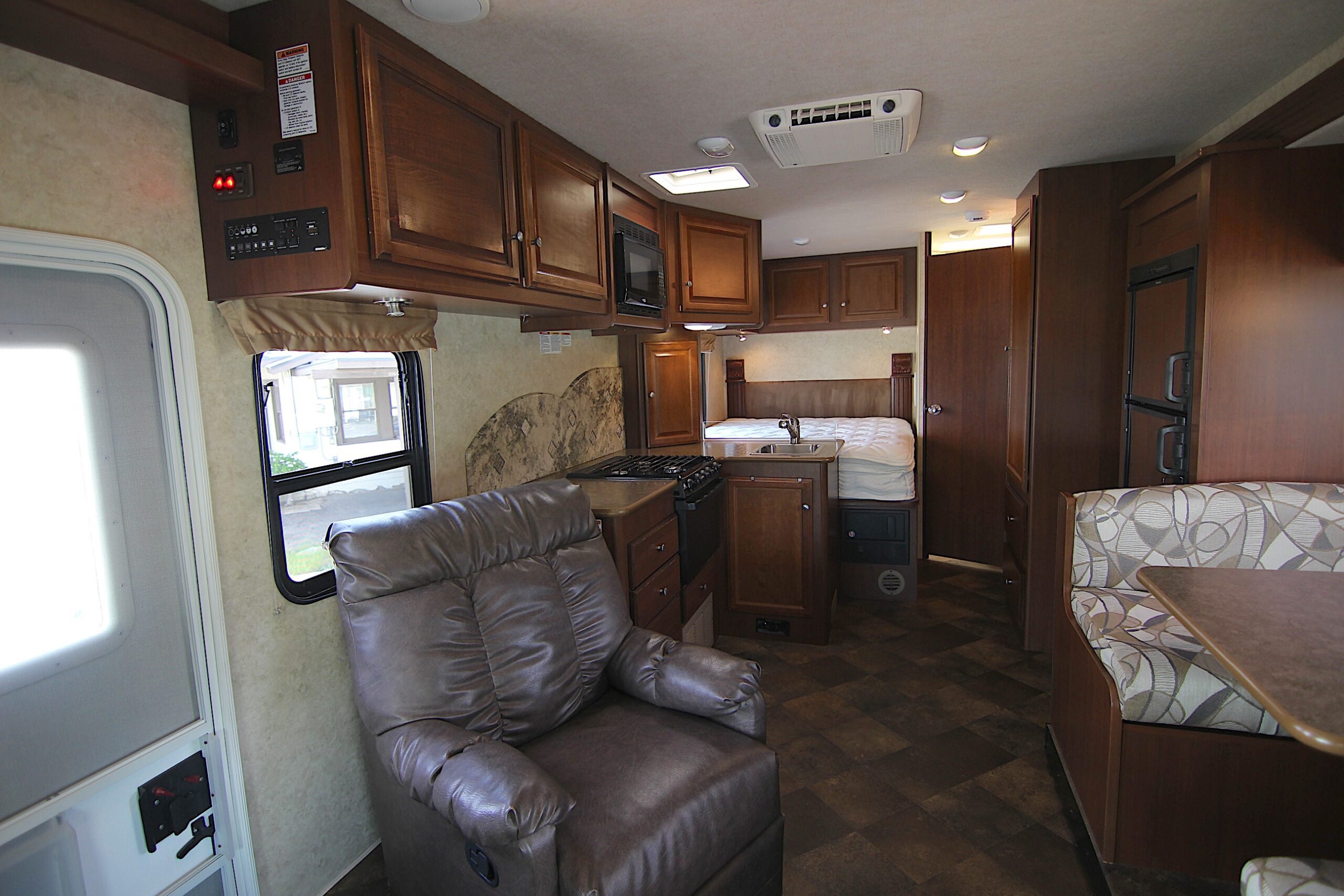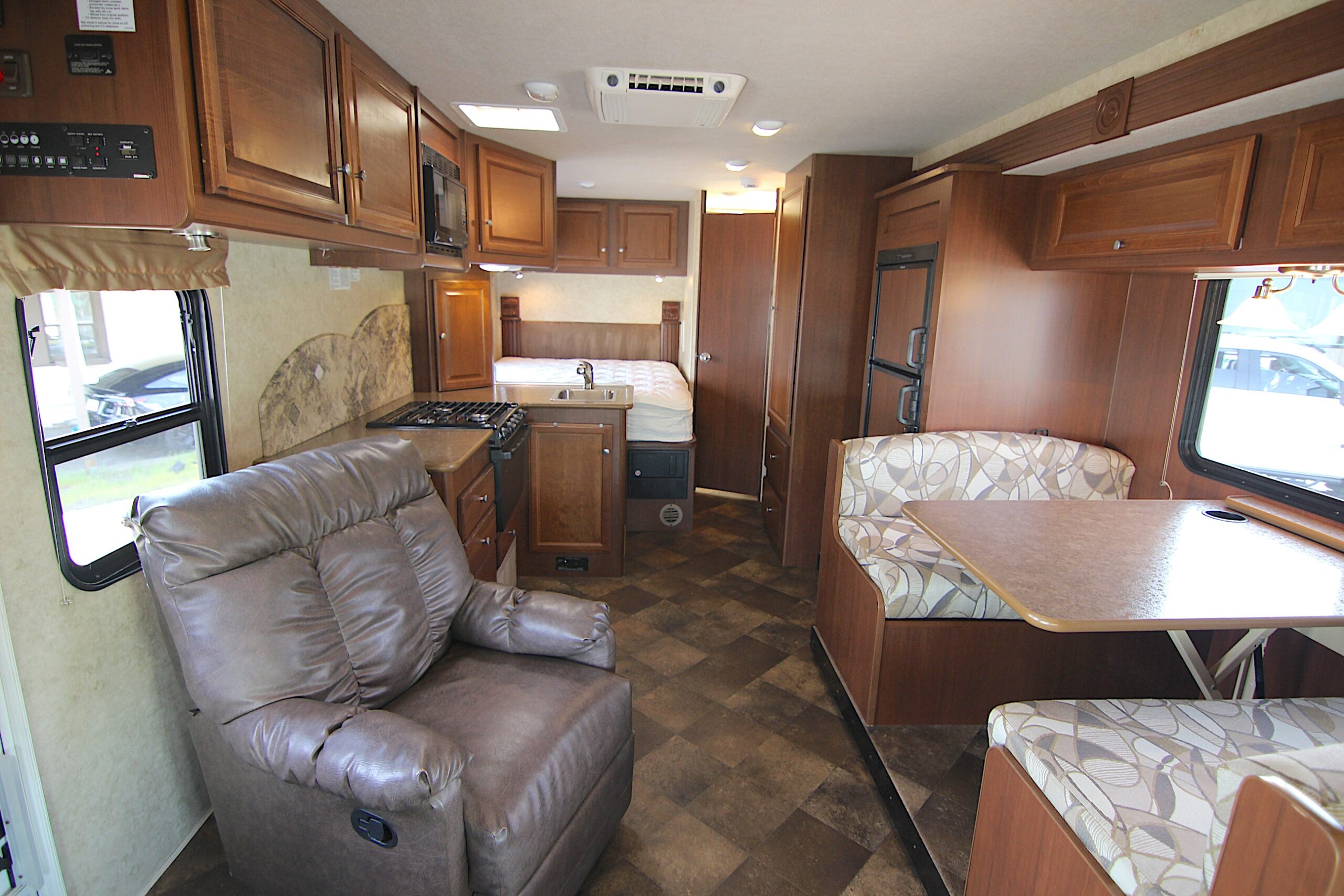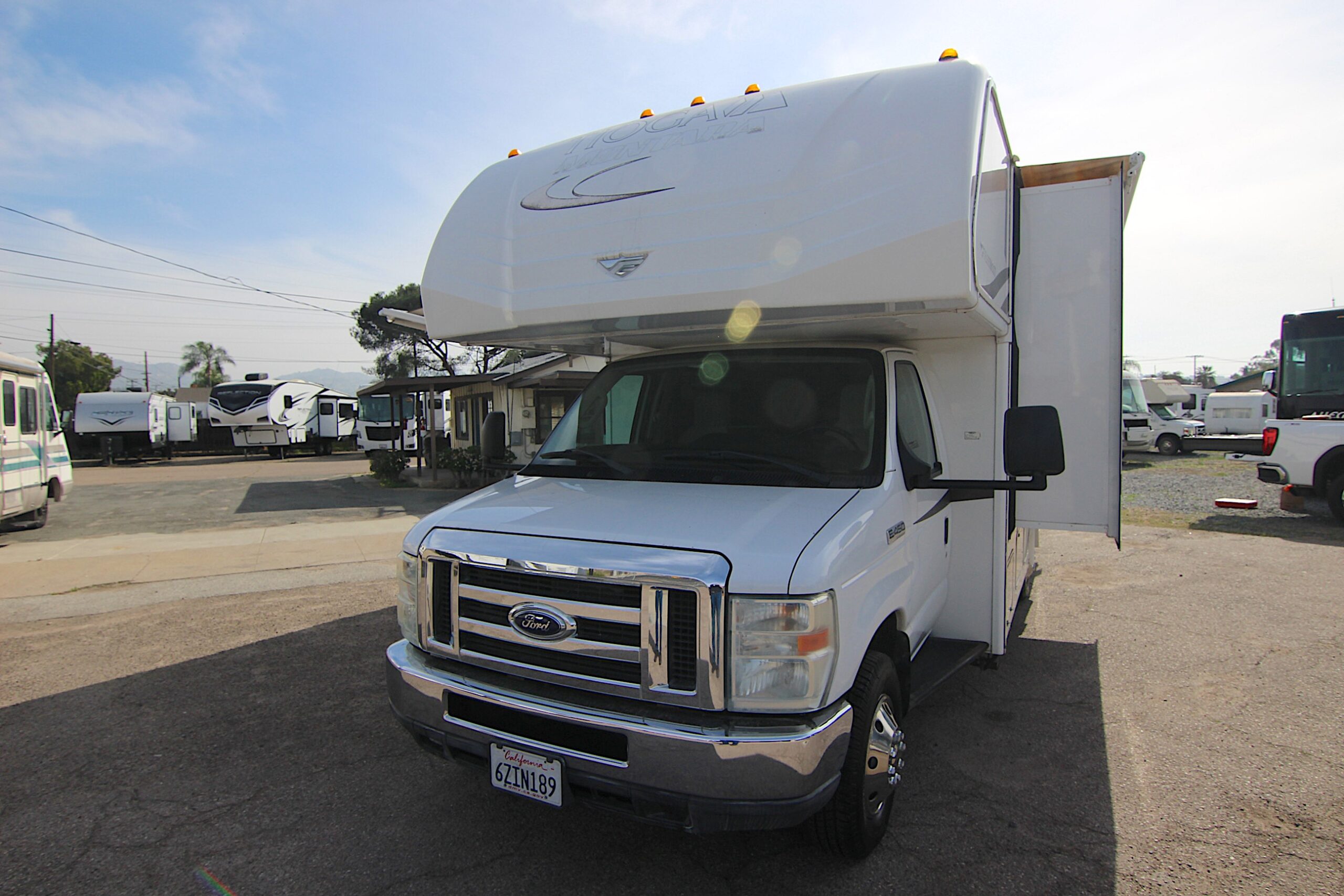 Ford E-450 with only 22,950, slide-out with awning topper, large booth dinette, 2024 Michelin tires, pass through outside storage, roof air vent, sleeps 6, tow package, roof ladder, fiberglass roof, 4.0 Onan generator with only 95 hours, smooth fiberglass exterior with aluminum construction, 30 amp service, large electric patio awning, am/fm stereo with outside speakers, over head queen bed, television antenna, linoleum throughout, three burner cooktop, microwave and oven, propane electric refrigerator and freezer, cold roof air conditioning and forced floor heater, water heater, large outside storage, two electric entry steps, rear queen bed, private bathroom, stand up shower with skylight, wardrobe, kitchen, porcelain toilet, back up camera.