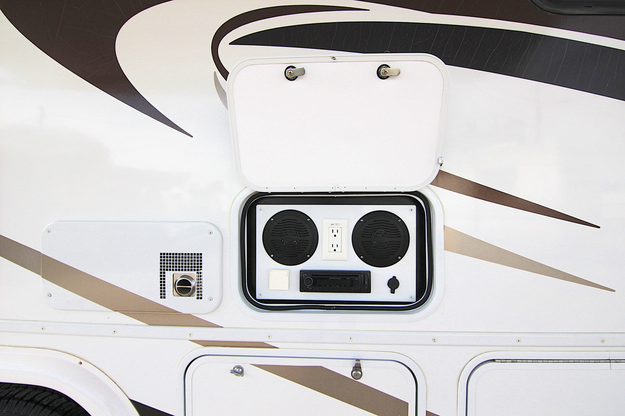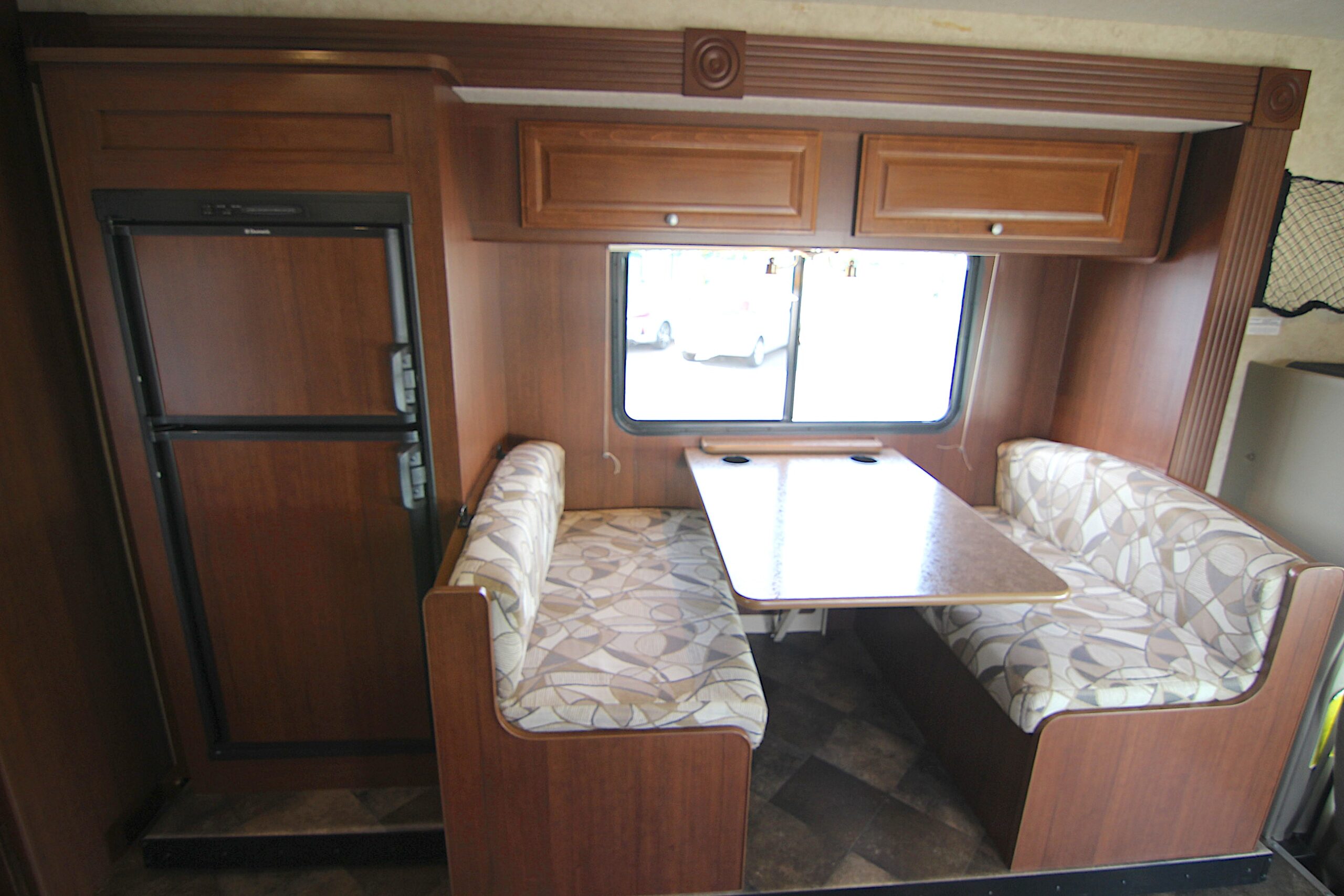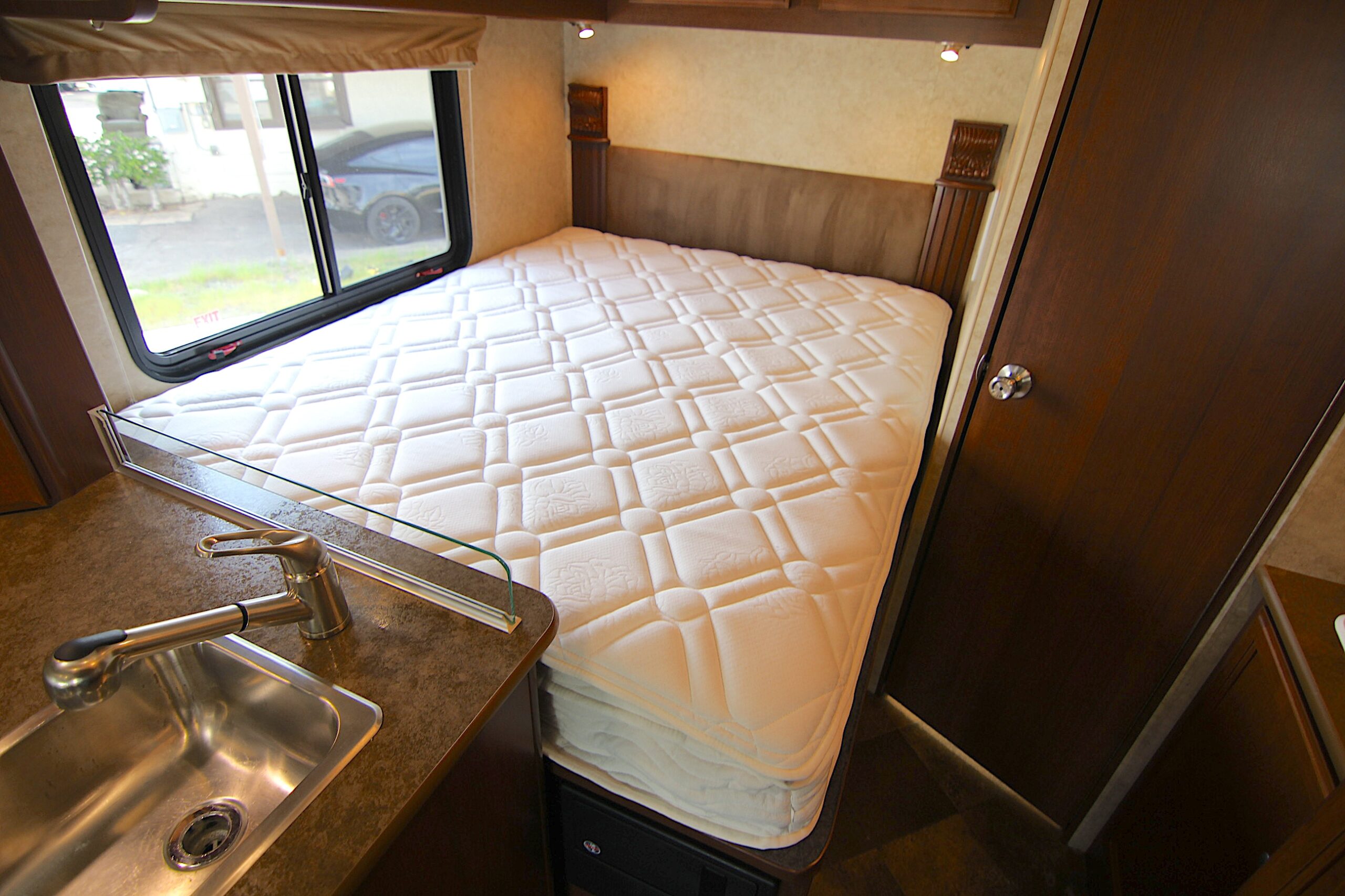 Ford E-450 with only 22,950, slide-out with awning topper, large booth dinette, 2024 Michelin tires, pass through outside storage, roof air vent, sleeps 6, tow package, roof ladder, fiberglass roof, 4.0 Onan generator with only 95 hours, smooth fiberglass exterior with aluminum construction, 30 amp service, large electric patio awning, am/fm stereo with outside speakers, over head queen bed, television antenna, linoleum throughout, three burner cooktop, microwave and oven, propane electric refrigerator and freezer, cold roof air conditioning and forced floor heater, water heater, large outside storage, two electric entry steps, rear queen bed, private bathroom, stand up shower with skylight, wardrobe, kitchen, porcelain toilet, back up camera.